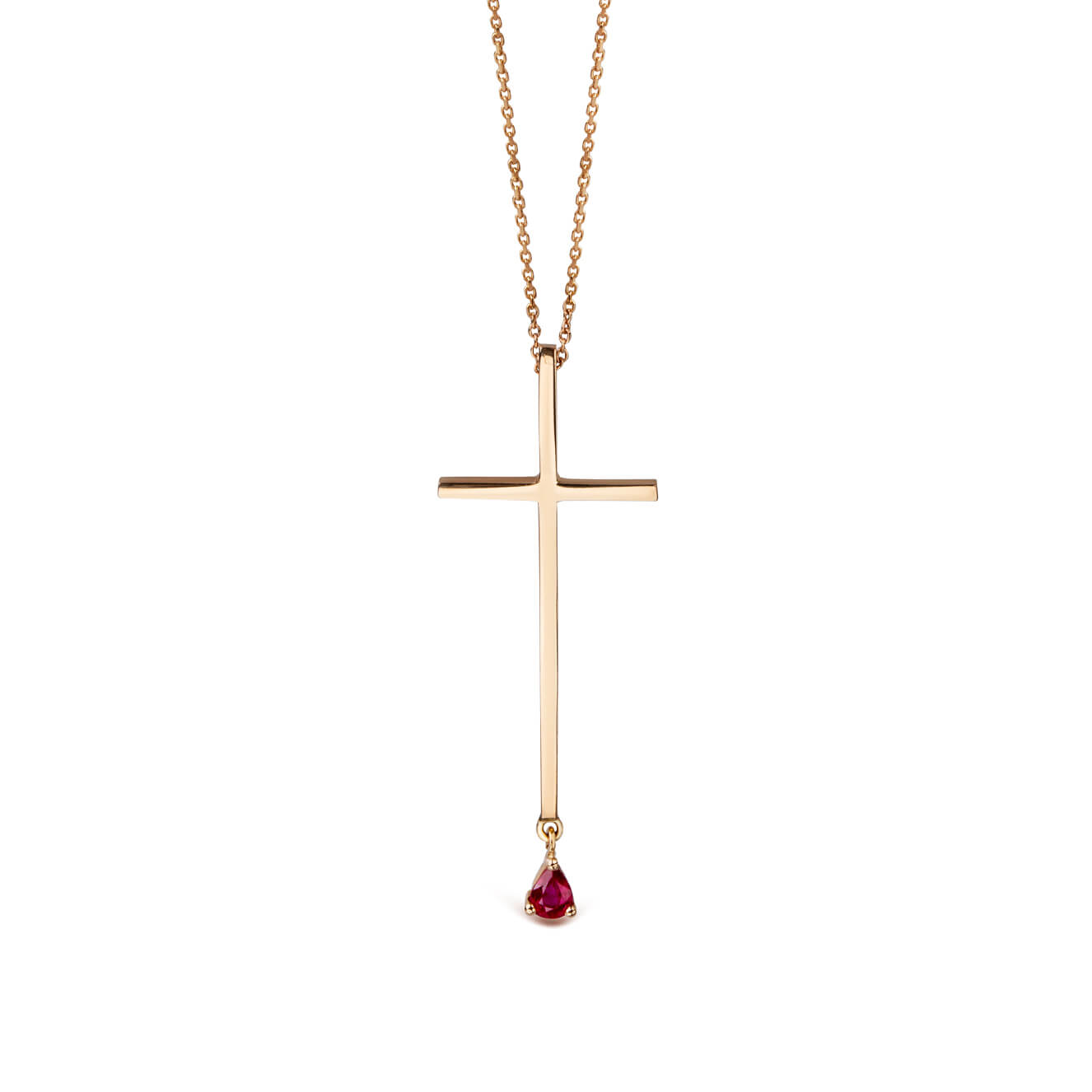 14K rose gold cross with a tear drop shaped ruby at the bottom.