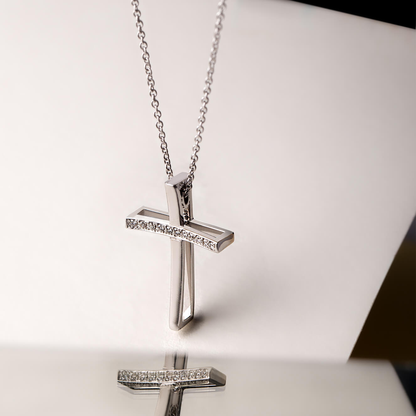 18k solid white gold cross necklace, set with natural white diamonds. The cross symbolizes faith, protection, and spiritual strength, while the diamonds represent purity, love, and inner light.
