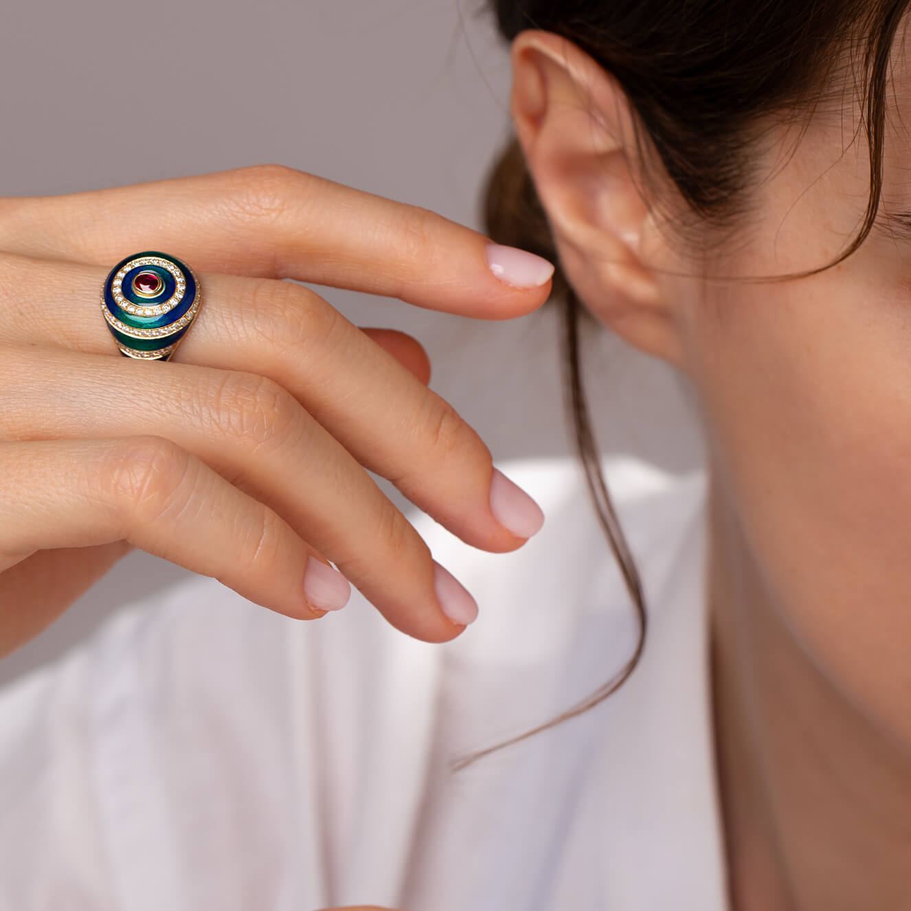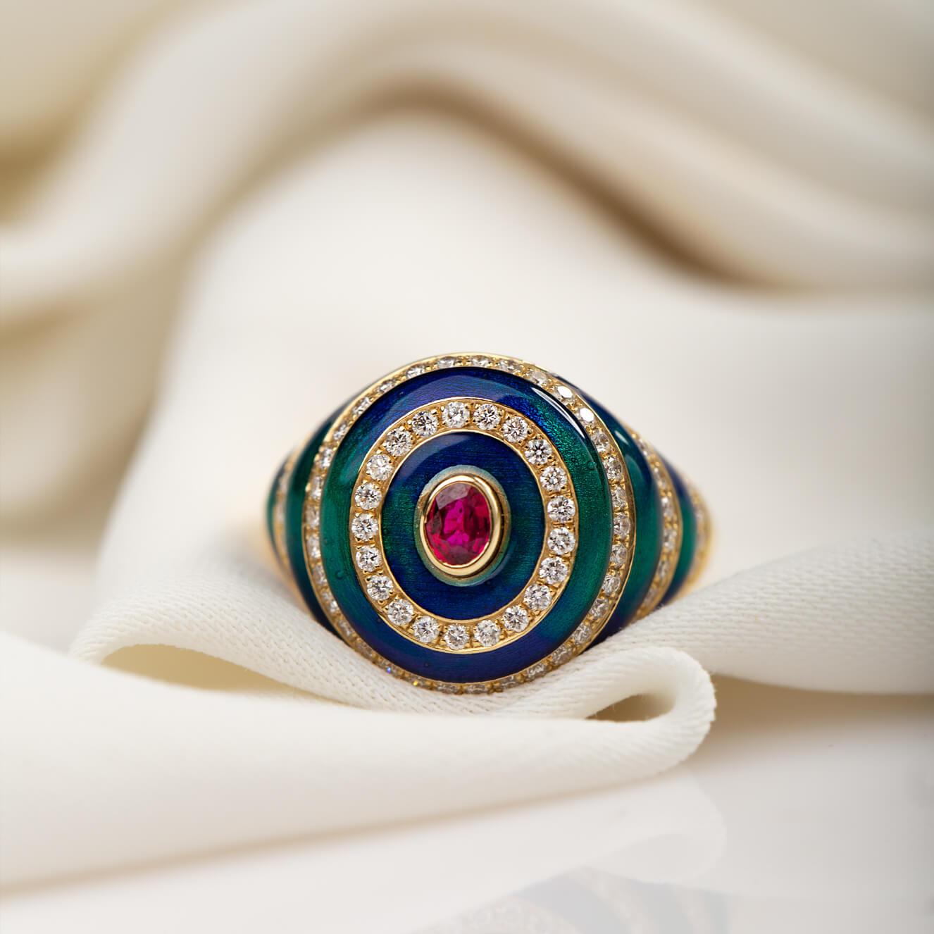 18K yellow gold ring with blue and green enamel, natural diamonds and an oval ruby in the centre. This ring features a vibrant enamel design, creating a unique statement piece. The rich colors are beautifully complemented by sparkling natural white diamonds delicately set around the band, adding brilliance and elegance. At the heart of the design sits a captivating natural oval ruby, bringing a fiery touch and timeless charm to the ring. The interplay of colorful enamel, shimmering diamonds, and the vivid ruby creates a harmonious balance between bold artistry and refined sophistication.