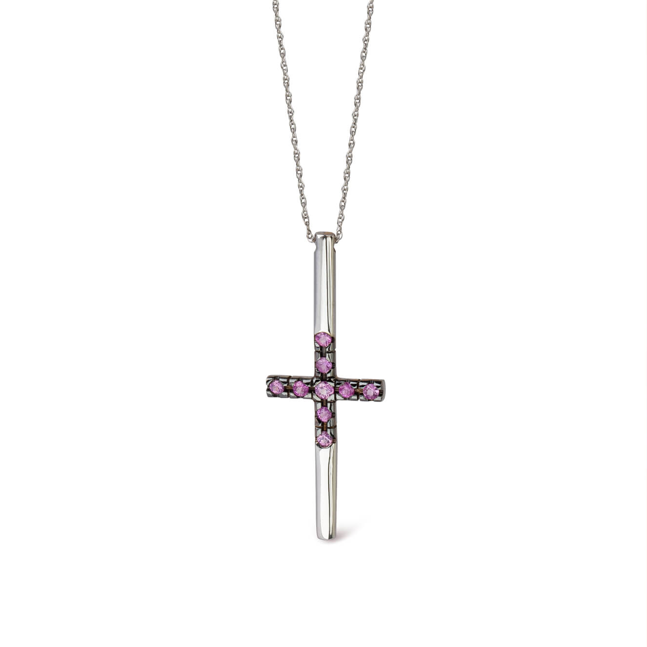 brilliant 18k white gold cross-pendant with nine vibrant pink sapphires weighing 0.50 cts. accompanied by a 18k white gold chain.